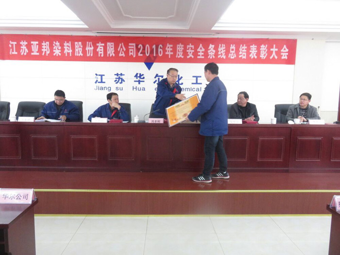 2017年1月16日下午14:30,股份公司安全条线在华尔化工三楼会议室召开了2016年度安全条线总结表彰大会。公司安全部门主管及先进个人、班组代表共40人参加了本次会议,会上各公司对2016年的安全管理情况及2017年的工作计划进行了交流发言。随后,为先进班组、先进个人颁发了奖状、证书及奖金。会议^后,周多刚副总经理充分肯定了2016年的安全工作,要求安全条线各级人员继续努力,为公司发展保驾护航。(图为周多刚副总为连云港分公司九车间1#绿丙班颁发安全生产先进班组奖)