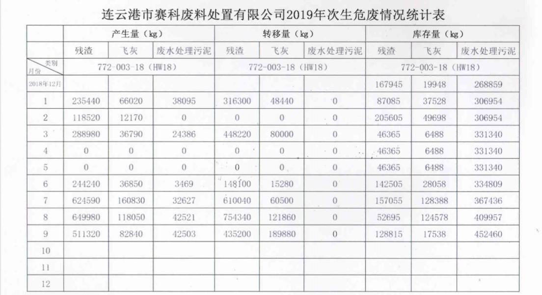 转载请注明出处(赛科2019年次生危废情况统计表: